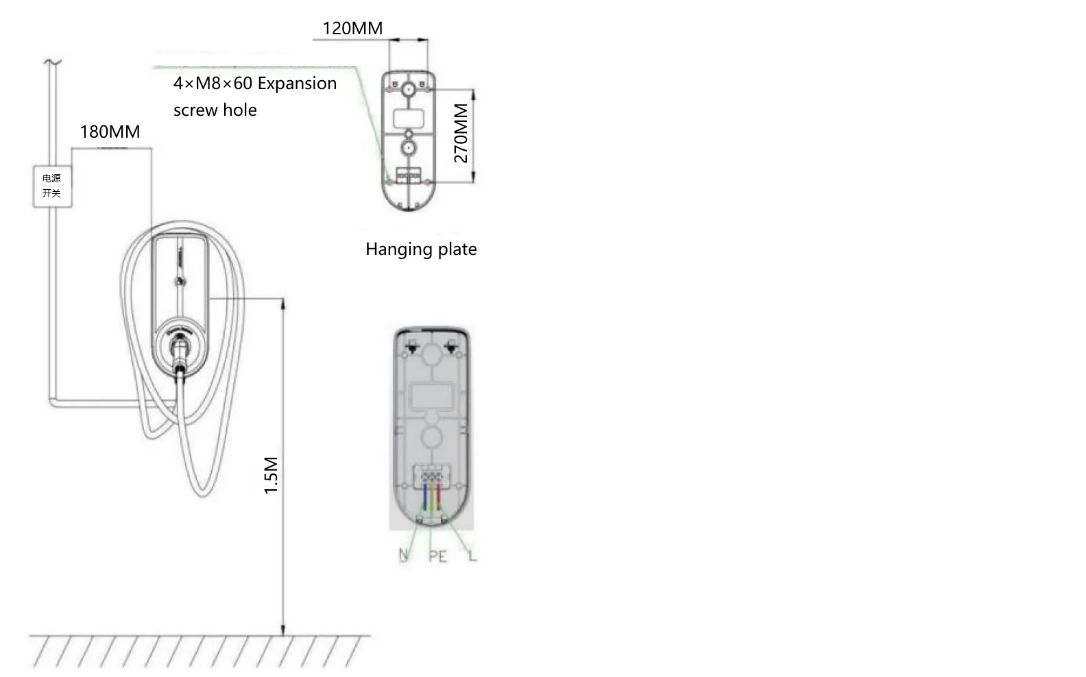 1) Laadimisvaia kõrguse võrdlusandmed maapinnast (1,3-1,5 meetrit)2) Märkige seinale tagaplaadile kinnitusava asukoht vastavalt tagaplaadi kinnitusava asukohale.